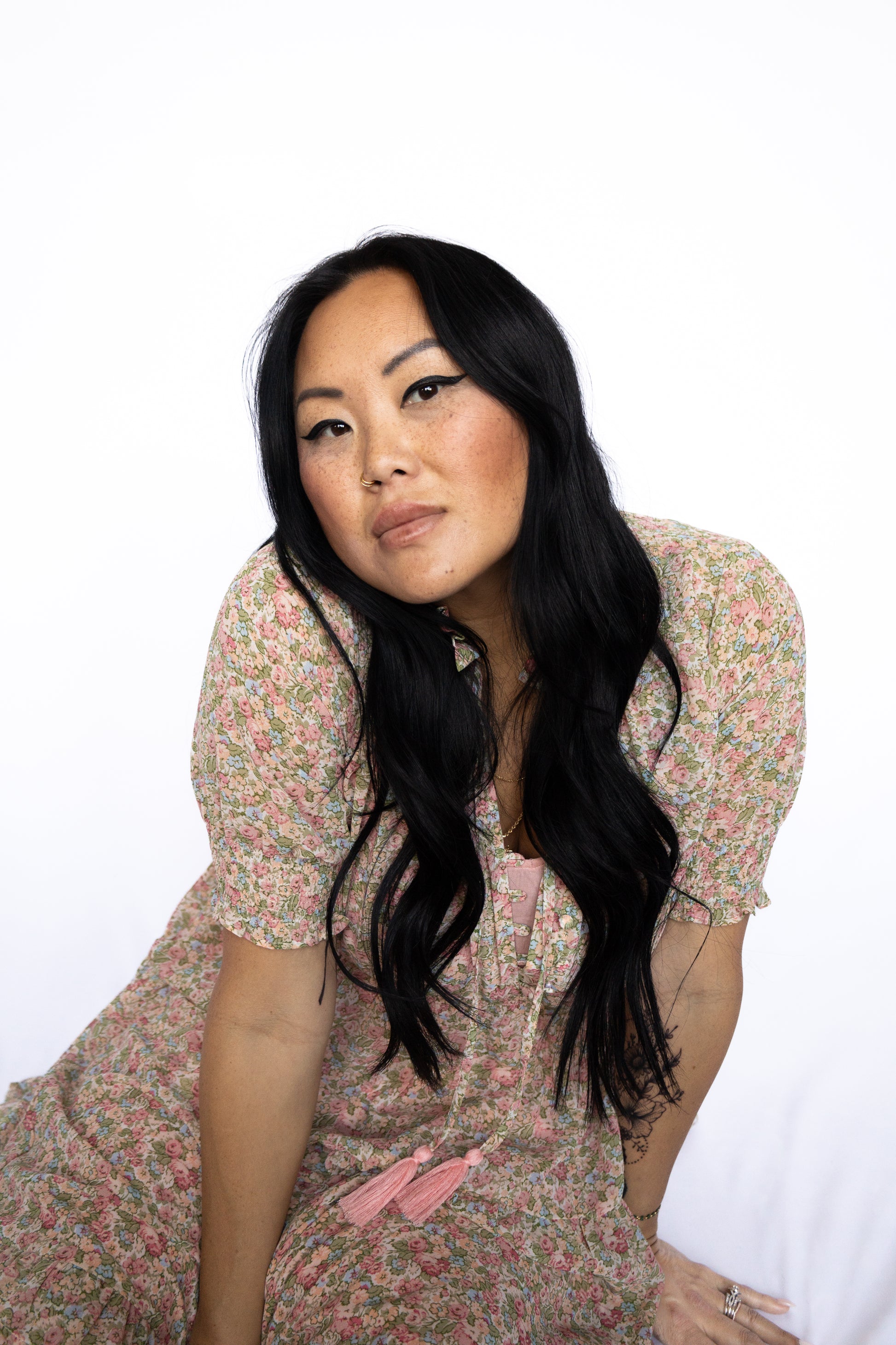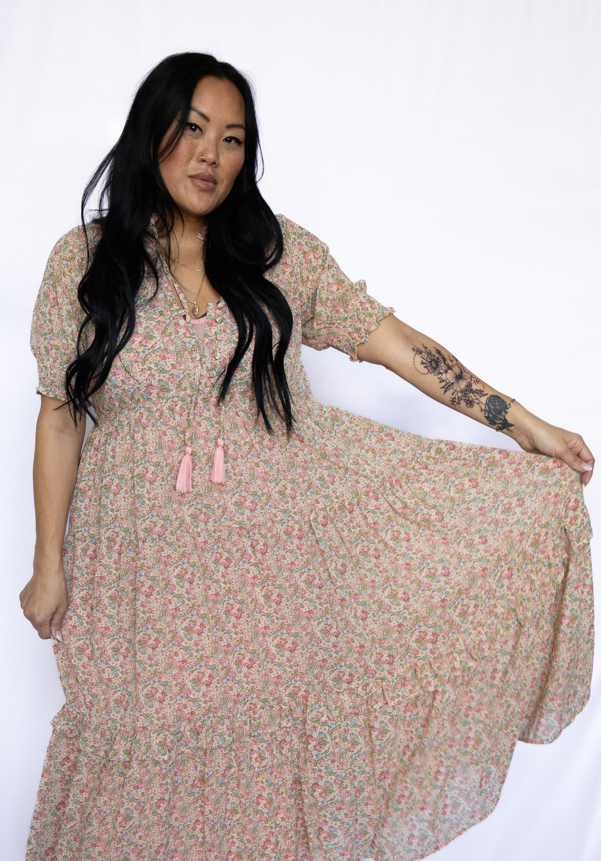 A sweet and flirty chiffon maxi dress in a boho floral print, featuring charming ruffle tiers along the V-neckline. This relaxed and flowy silhouette is perfect for a cute and casual warm-weather look.