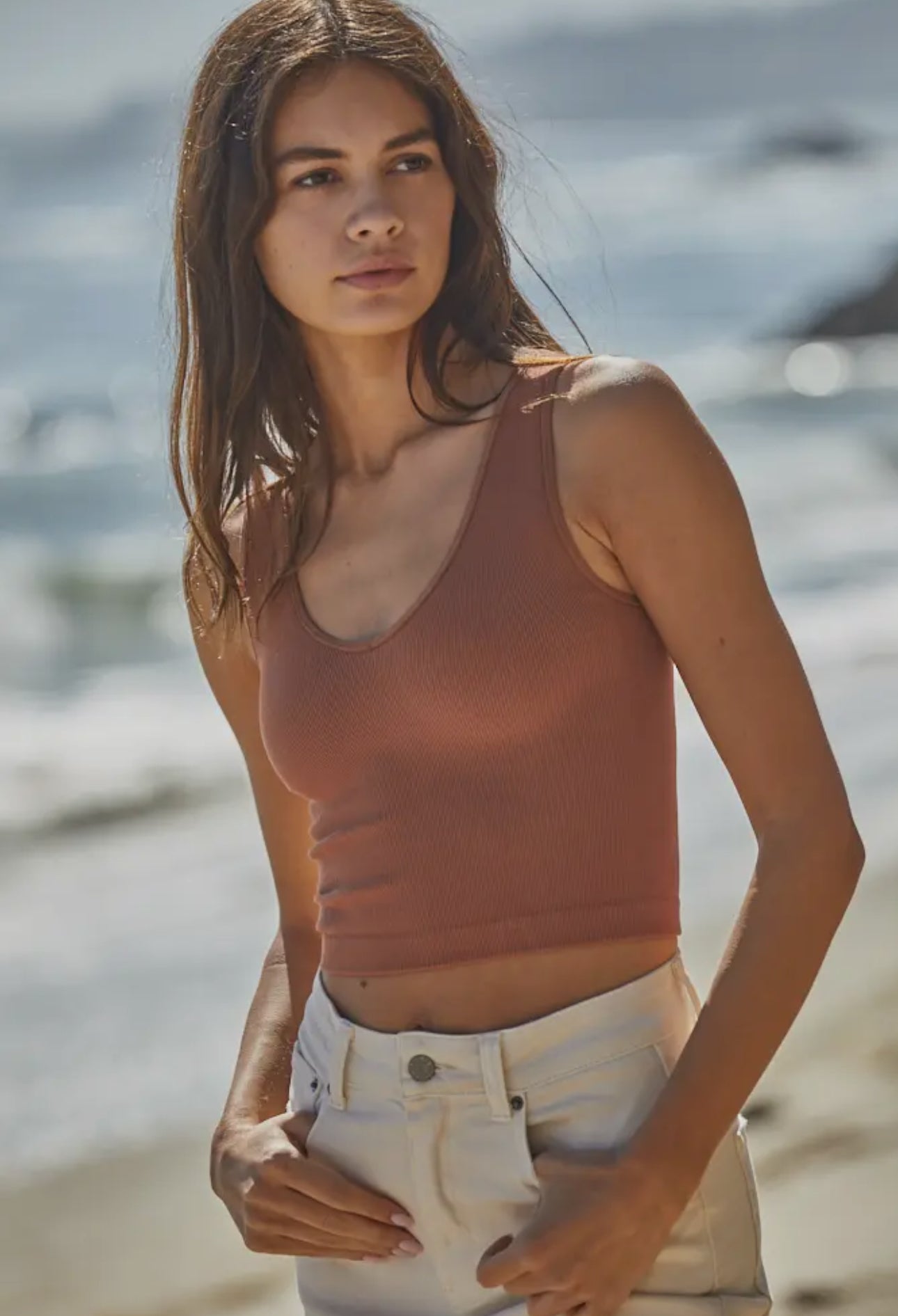 A wardrobe essential with endless versatility. This seamless ribbed crop tank features a reversible neckline, giving you two looks in one — a classic U-neck on one side and a flattering V-neck on the other. Designed with a soft, stretchy modal blend for a smooth fit and all-day comfort, it’s perfect for layering or wearing solo.