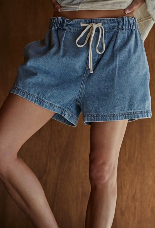 Woven Denim Washed Cotton Relax Fit Wide Leg Shorts